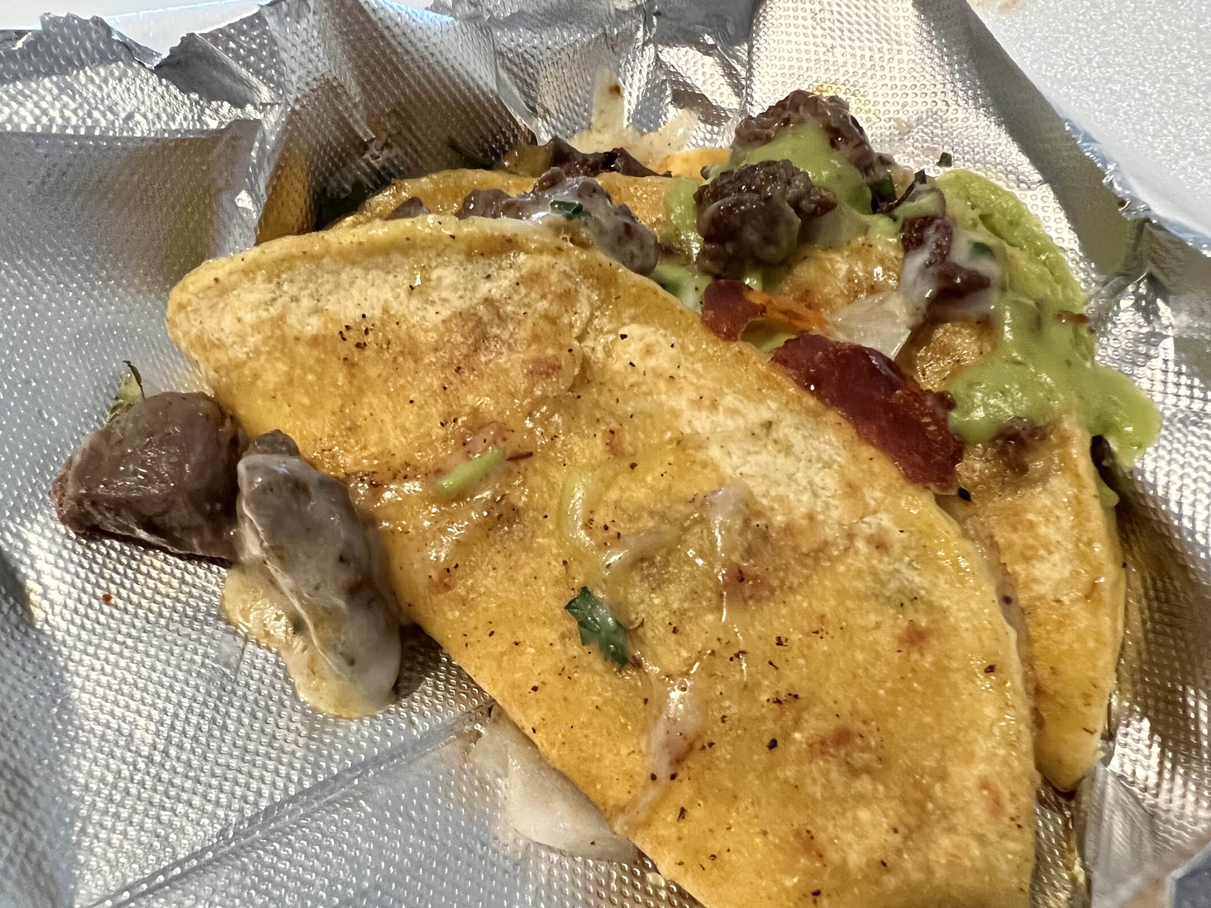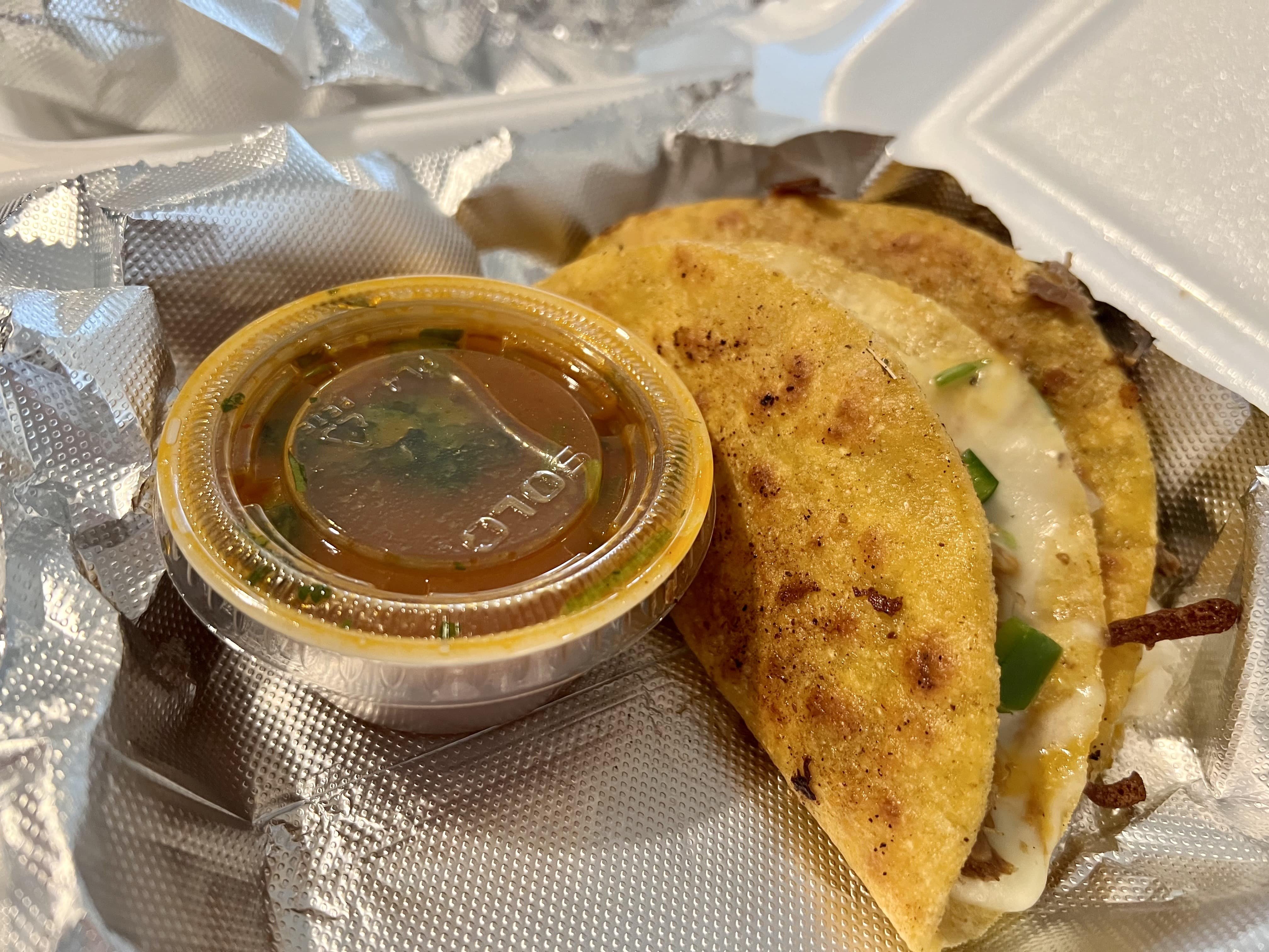 타코의 또띠아를 기름에 굽고, 그 위에 고기와 치즈, 야채 넣고 접은 것 같아요.