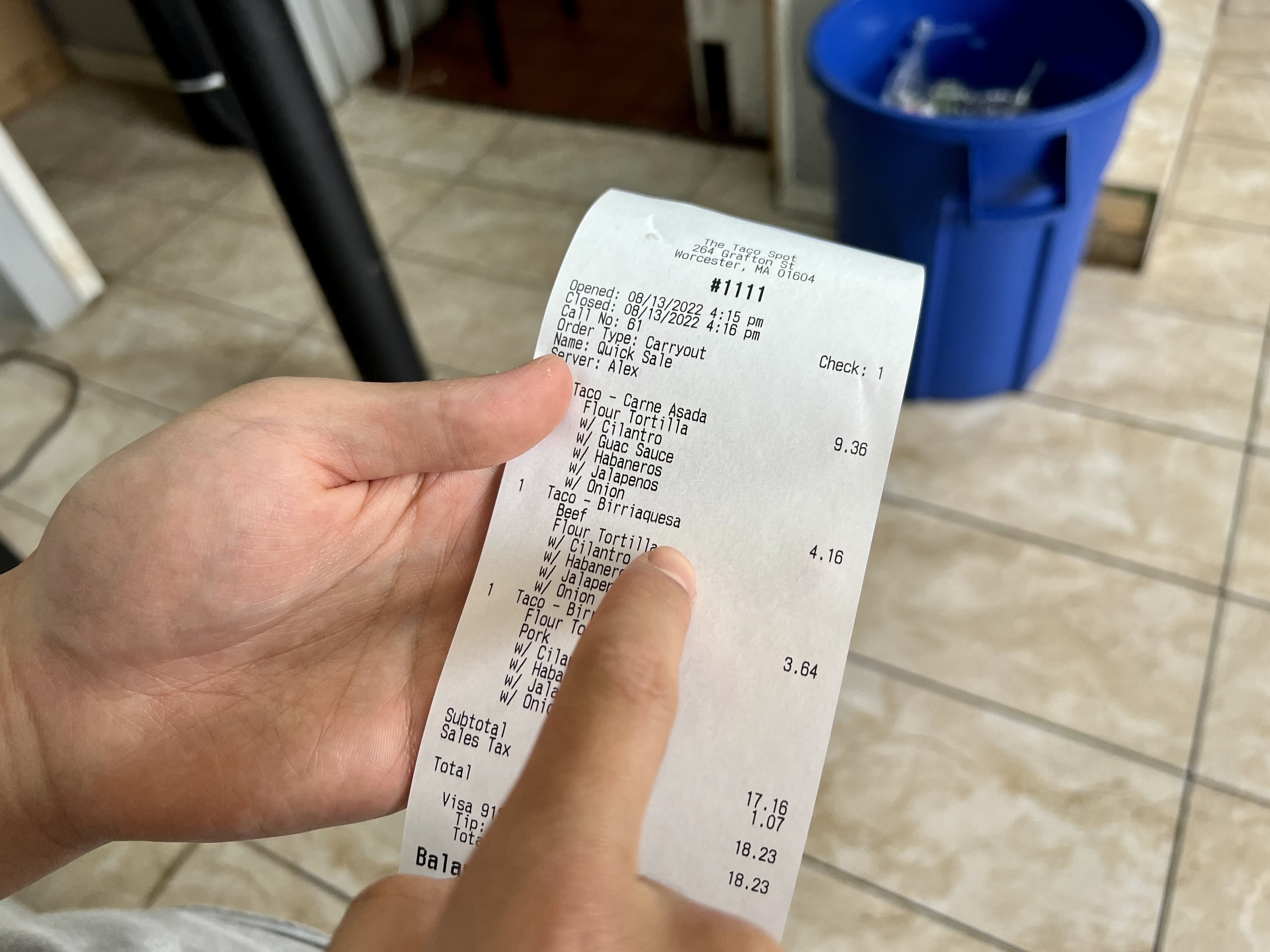 타코 4개 시켜서 18.23불 나왔어요.