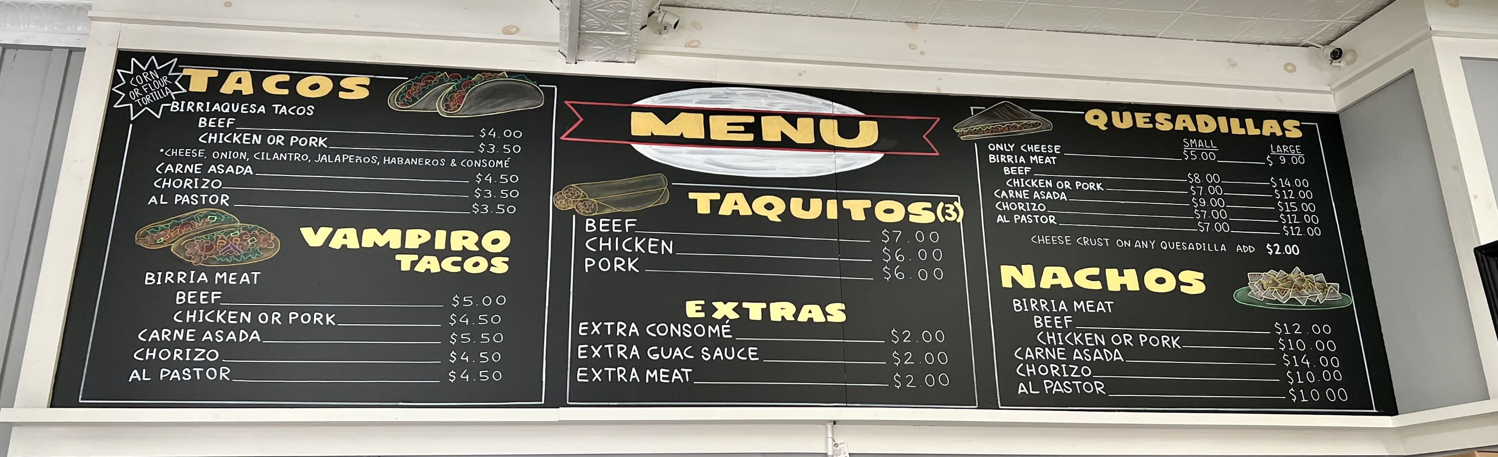 메뉴는 타코, 뱀파이어 타코, 타키 토스, 퀘사디아, 나초 이렇게 준비되어 있어요.