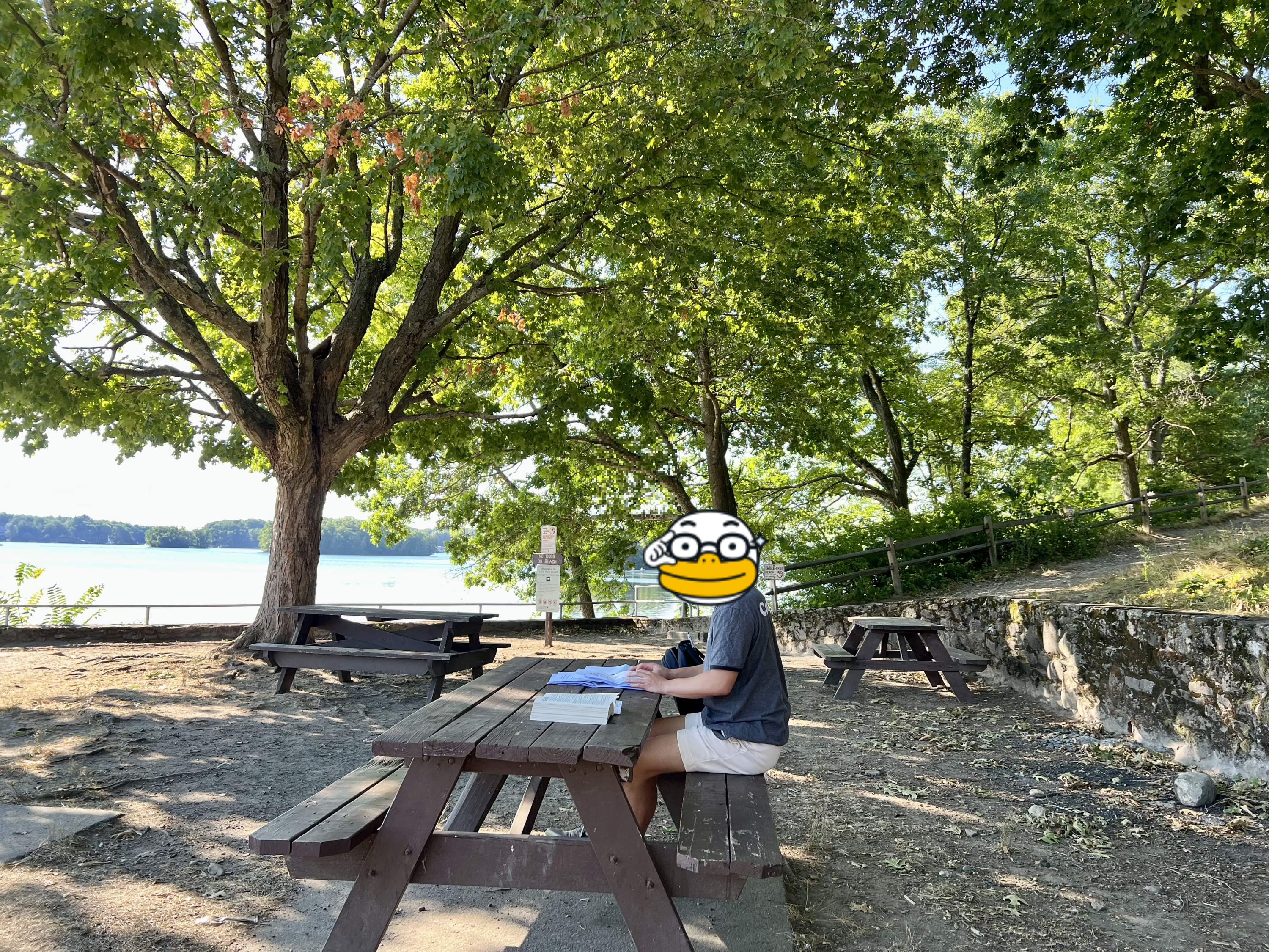 공원에 도착해서 강이 내려다 보이는 벤치에 자리 잡았어요.