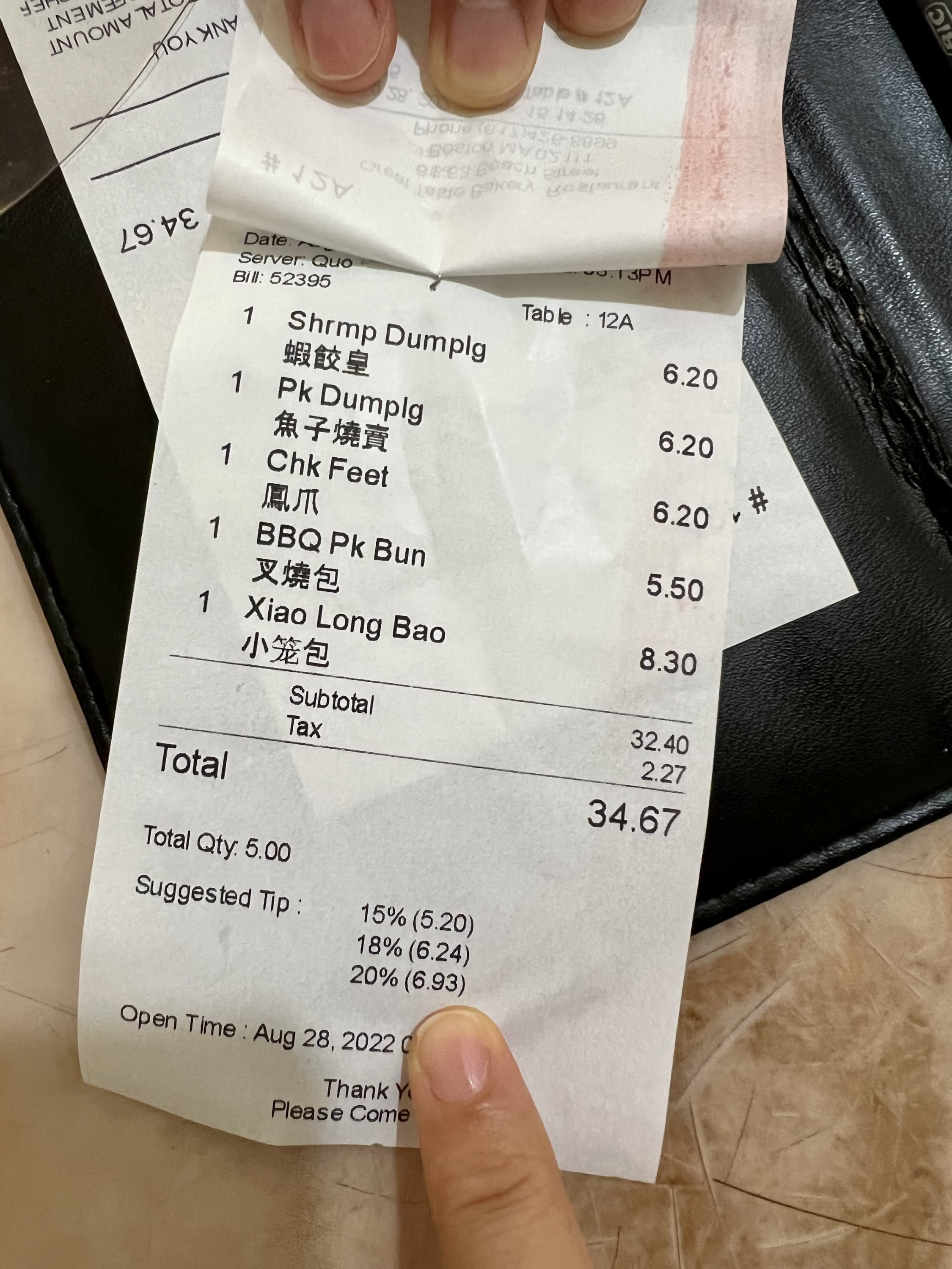 이 날은 5개 시키고 $34.67불 나왔어요.