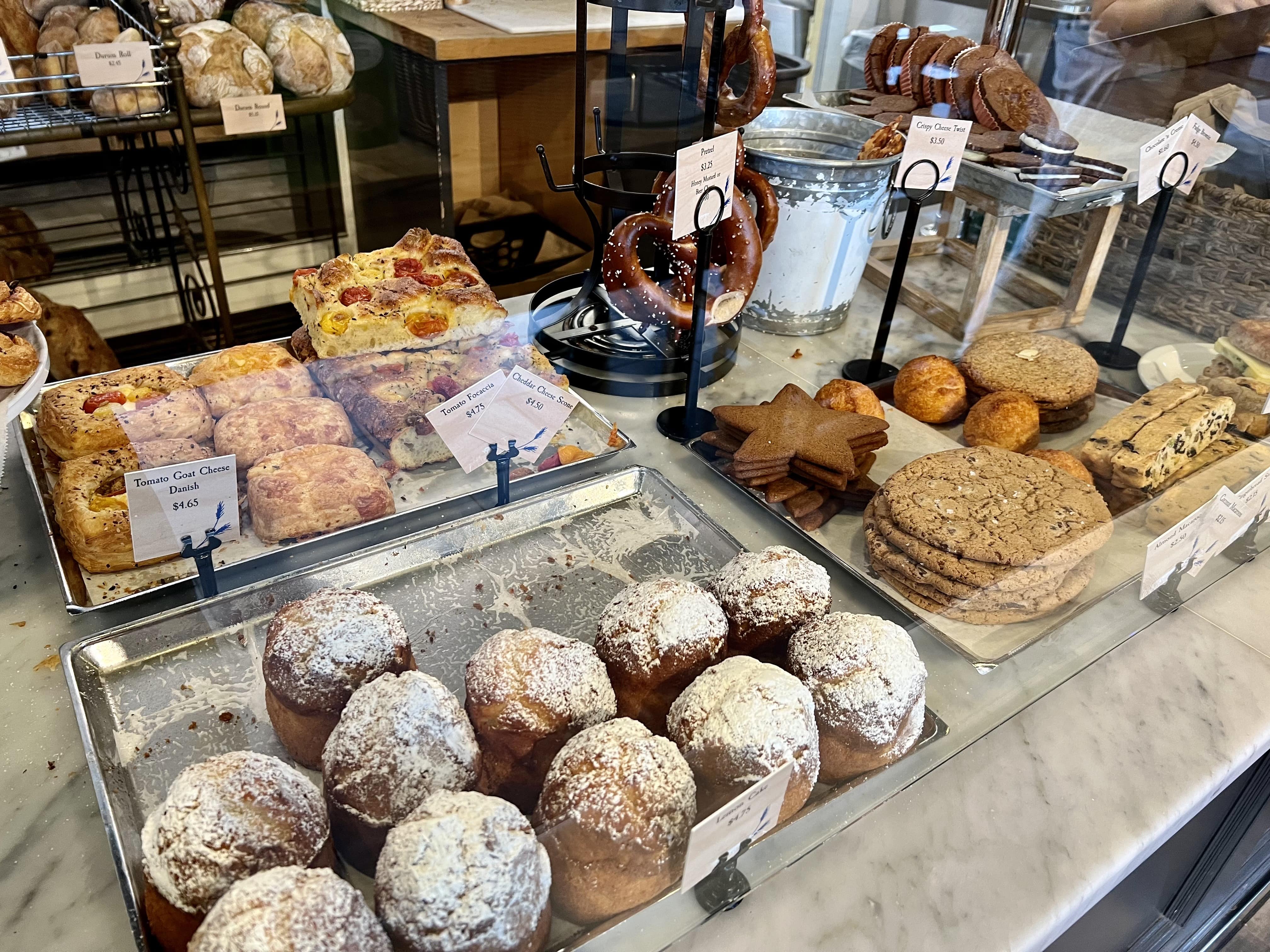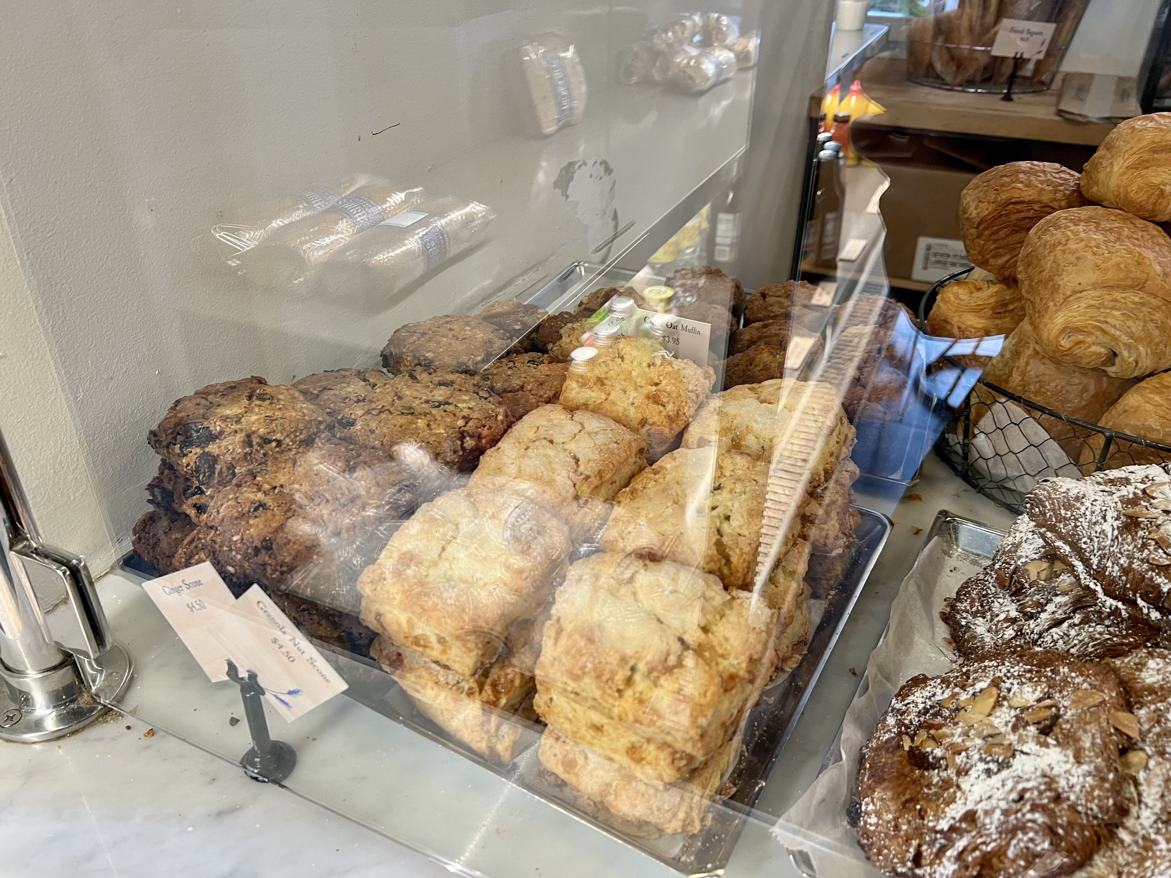 진열대에서 빵 종류를 볼 수 있는데, 페스츄리, 크루아상, 스콘, 쿠키 등 다양하게 준비되어 있어요.