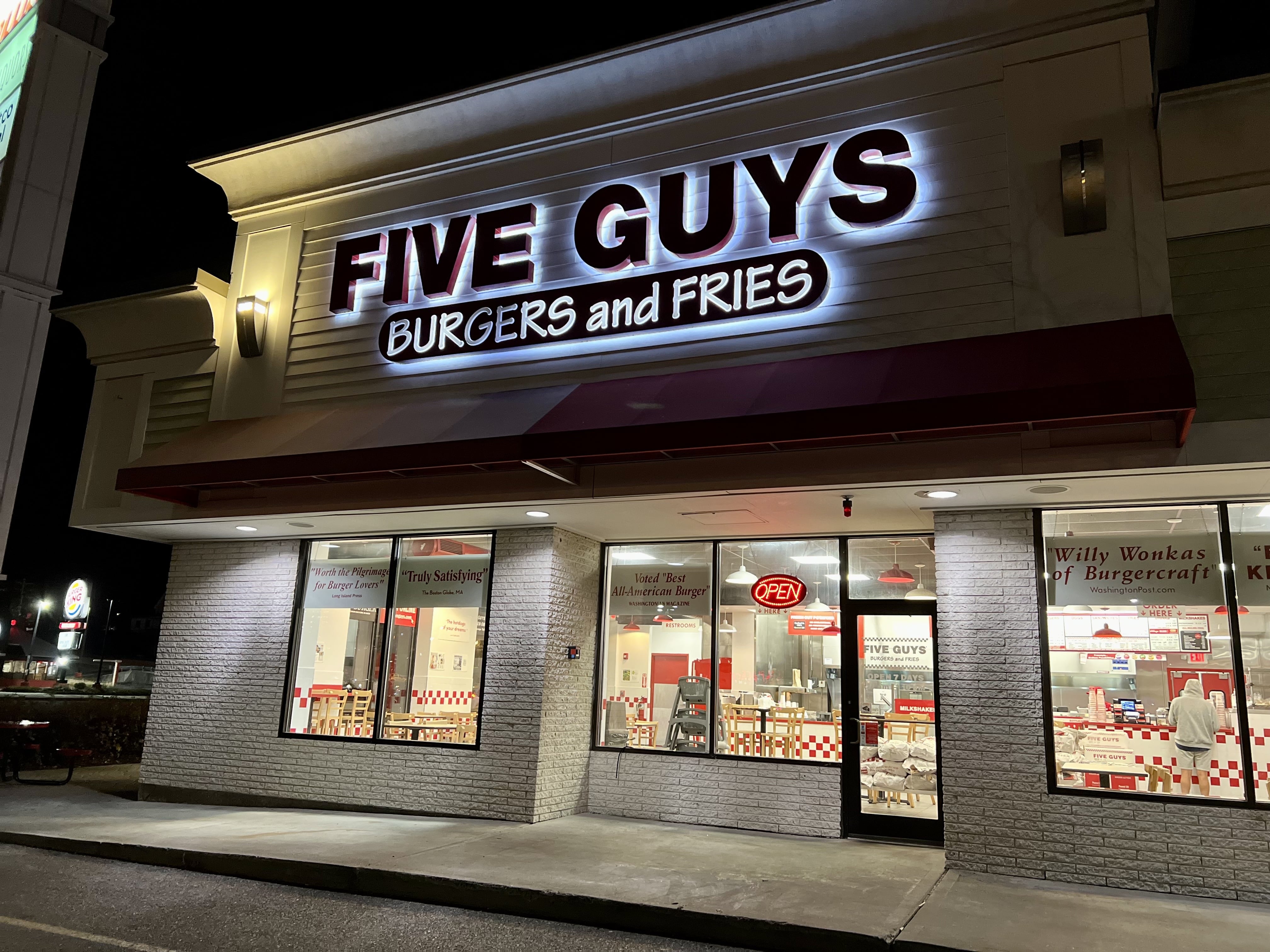 간판에는 이렇게 크게 FIVE GUYS라고 크게 쓰여있고, 아래 burgers and fries라고 쓰여있네요.